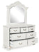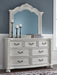 Transform your inner sanctum into a haven of timeless elegance and functionality. This traditionally styled dresser with mirror is adorned in a classic antiqued white finish, highlighted by a serpentine-shaped front with thick decorative moulding. Its drawers are packed with ample storage possibilities. And did we mention the mirror's crowning glory? Talk about relaxed refinement.